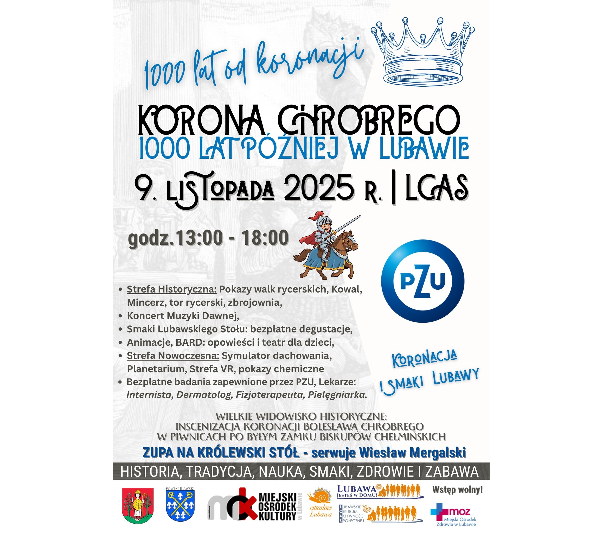 W niedzielę, 9 listopada 2025 roku, serdecznie zapraszamy wszystkich Parafian oraz mieszkańców Lubawy do udziału w wyjątkowym wydarzeniu historyczno-kulturalnym pod nazwą „Korona Chrobrego – 1000 lat później w Lubawie”. To