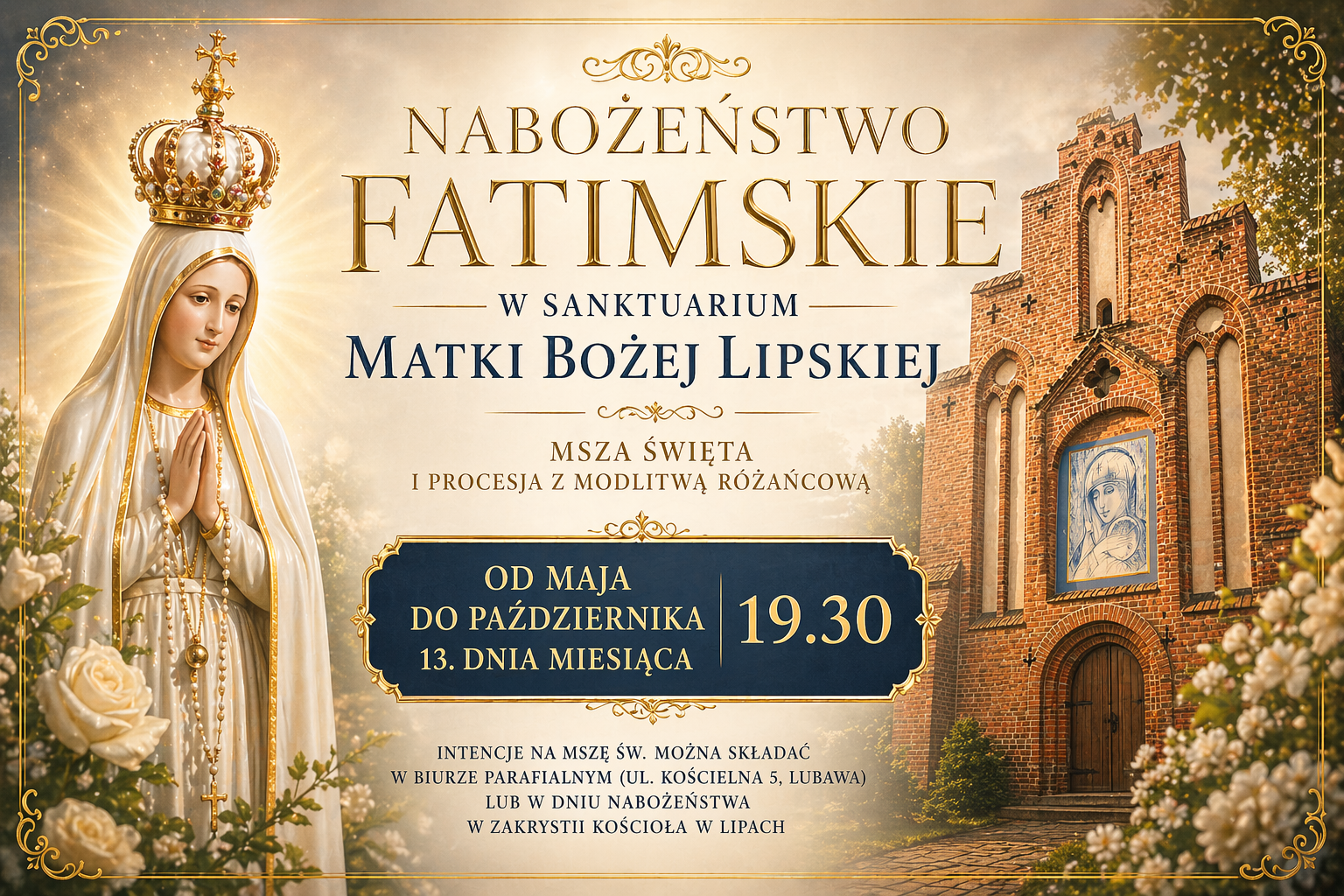 Aktualności | 21 kwietnia 2026 Od maja do października, każdego 13. dnia miesiąca o godz. 19:30 w Sanktuarium Matki Bożej Lipskiej w Lipach zapraszamy na nabożeństwa fatimskie: Mszę Świętą oraz procesję z modlitwą różańcową. To wyjątkowy czas spotkania z Maryją…